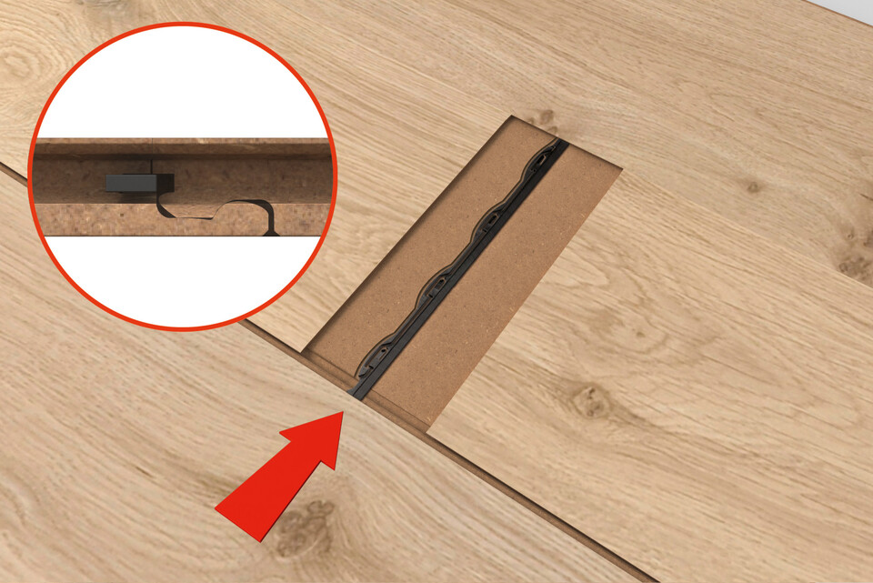 Various patented click systems are used for MEISTER floors. These mean that the floors can be laid very easily and using floating installation without glue or other adhesives. Each click system is tailored to the specific features and format of the flooring. The Masterclic Plus click system is used particularly frequently. What’s special about it: The end is only locked in place once the plank is laid in the following row. This ensures a particularly secure and dimensionally stable connection.