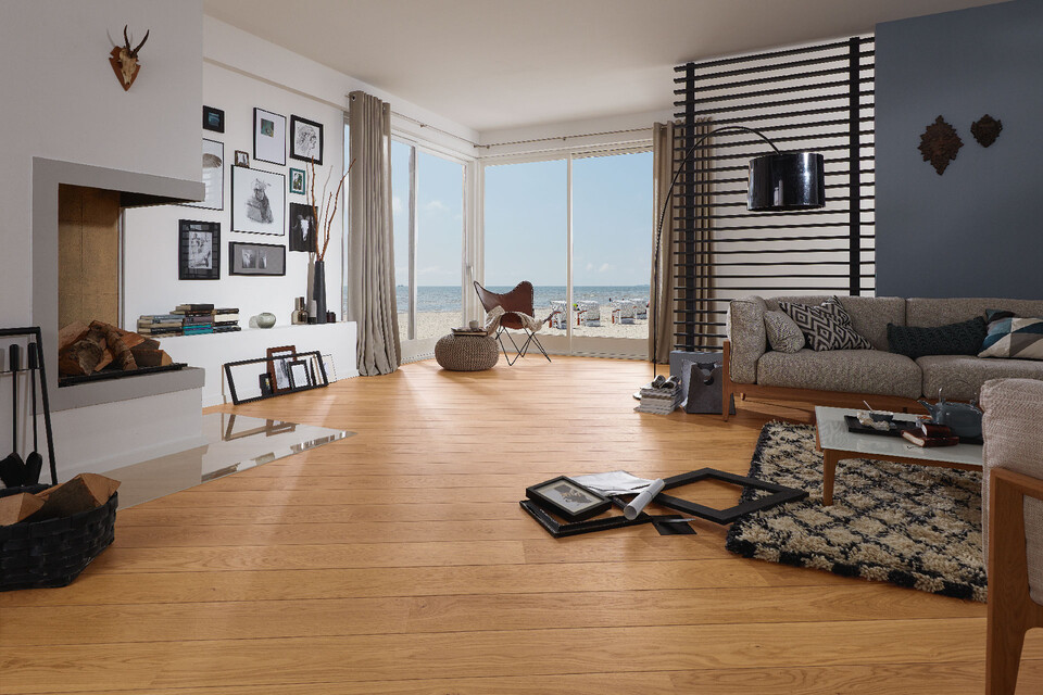 Nothing has an impact on the character of a room like the flooring you lay. But it’s not just the chosen wood, surface finish and colouring that play a role here, it’s also the direction in which the parquet or laminate flooring is laid that has a huge effect on the atmosphere of the room. Anyone looking to create a new look in their living room, kitchen or wherever it may be can make a strong start by considering how the flooring is laid. Small rooms can appear larger and particularly large spaces can be afforded greater structure. The choice of parquet or laminate flooring and how it is laid can even create a uniform, calming impact or achieve a more vivid effect. We can use a room to show you how visually different the laying directions can be.