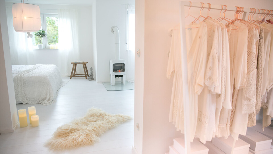 Here’s a peek towards the bedroom. We knocked down all of the lightweight partition walls upstairs, too, to create a more spacious look. My dressing room is open and features a couple of wardrobes in addition to these minimalistic hanging rails. In the background of this picture you can see my absolute favourite cupboard, which was made out of an old barn door.