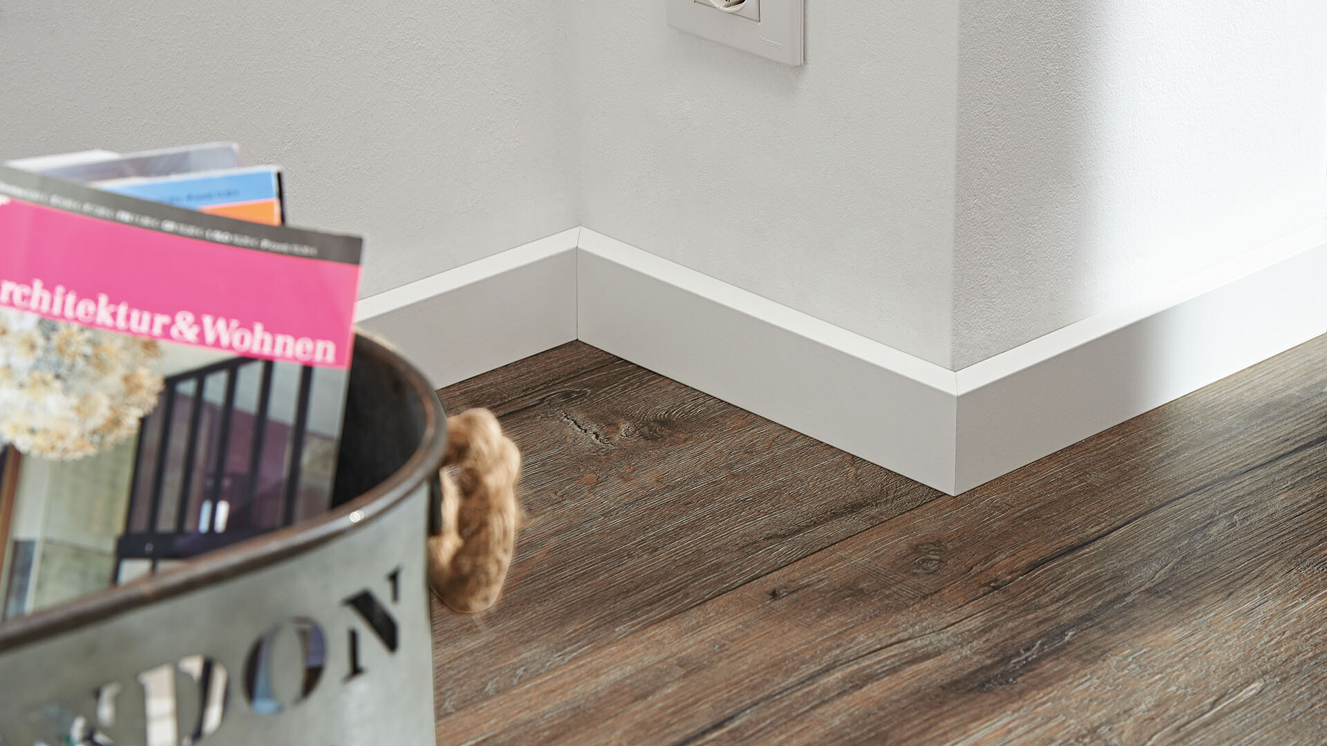 Zur Abdeckung des benötigten Wandabstandes von 10 mm finden Sie im MEISTER Sortiment farblich passende Leisten zum Dekor Ihres Vinylbodens oder neutrale Leisten in weiß oder schwarz, mit unterschiedlichen Höhen und Profilen. Für die Verlegung im Badezimmer bieten wir auch wasserresistente Leisten aus Kunststoff.