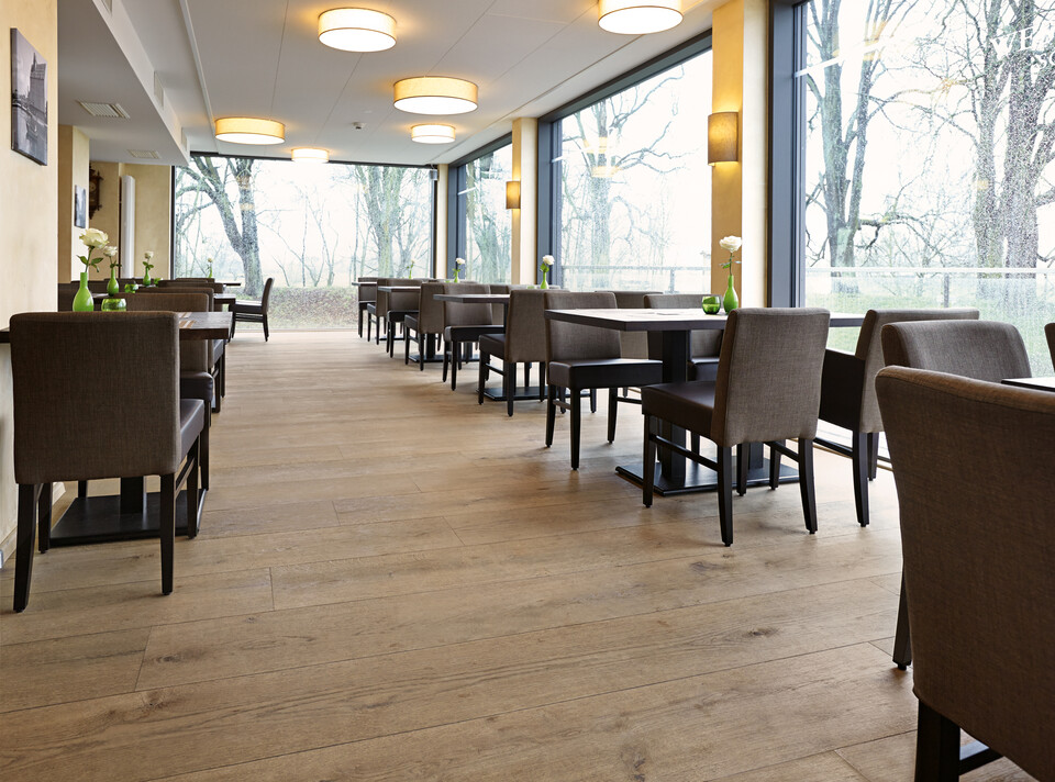 Environmental protection and energy-saving technology were important factors to consider during construction. The heating and lighting is managed and controlled to save energy. In addition to a heat and electricity bus system, which uses state of the art technology, a combined heat and power plant is used for heating. Waste heat recovery pumps were installed for the ventilation system. All the lights use energy-saving LED technology. The flooring is a perfect fit for the atmosphere of the modern hotel, which prioritises sustainability. Lindura is the ideal backdrop for the restaurant and banqueting suite. Its rustic, elegant appearance contrasts with the modern furnishings.